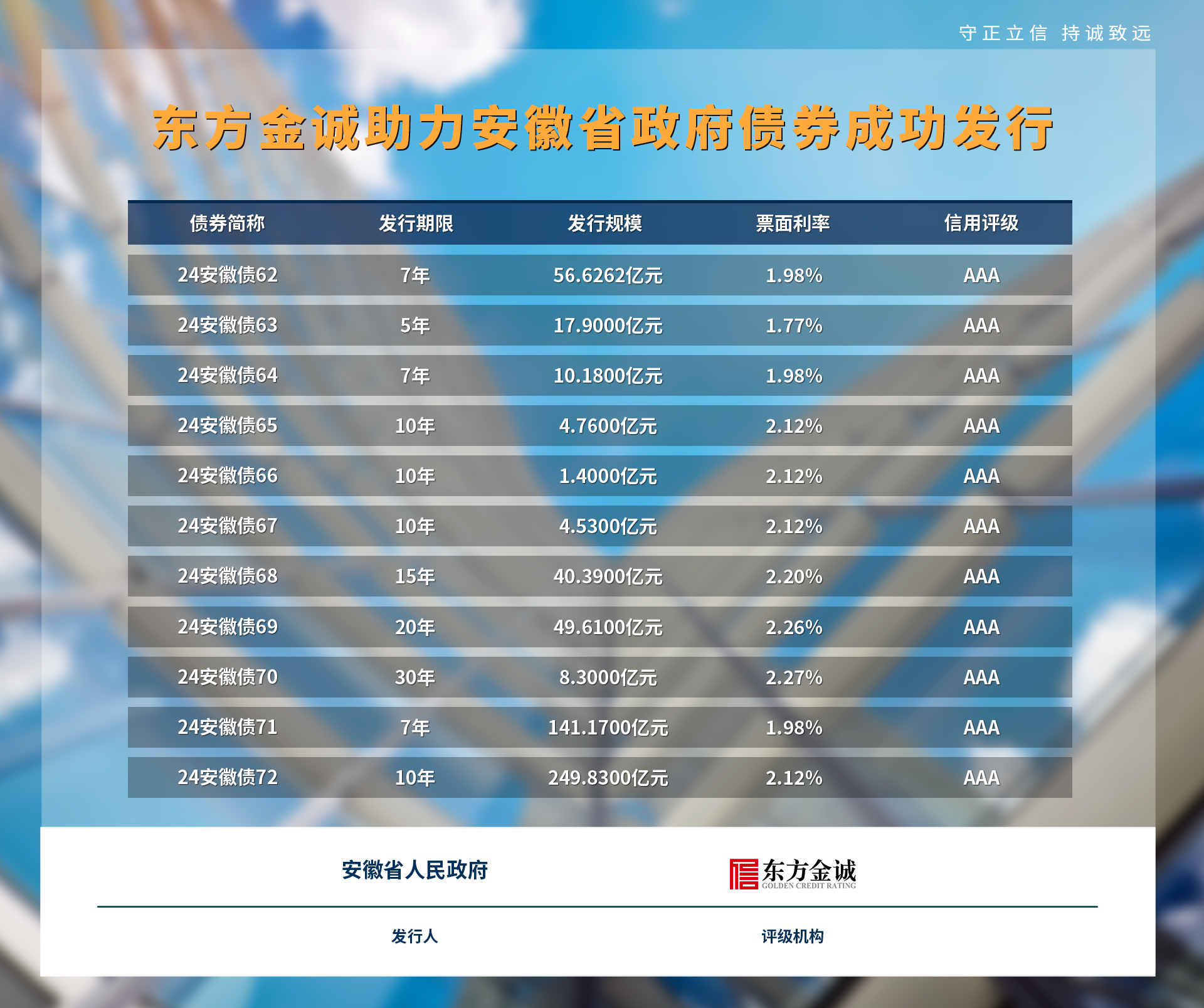 2024年9月19日,由东方金诚评级的多只安徽省政府债券成功发行。其中,地方政府一般债券1只,发行规模56.6262亿元;地方政府专项债券10只,总发行规模528.07亿元。