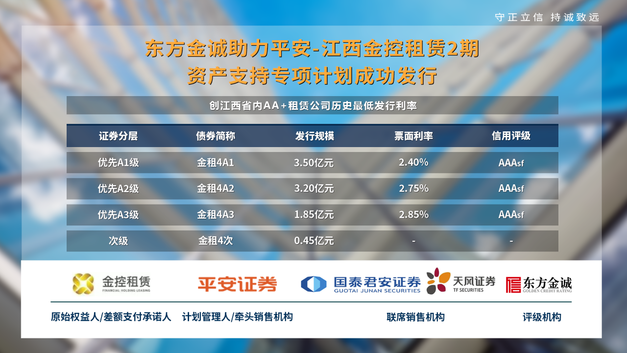 近日,东方金诚助力“平安-江西金控租赁2期资产支持专项计划”(以下简称“本期专项计划”)在深交所债券市场成功发行。本期专项计划发行总规模9.00亿元,其中优先级总发行规模8.55亿元,加权利率2.62%,创江西省内AA+主体评级租赁公司历史最低发行利率。